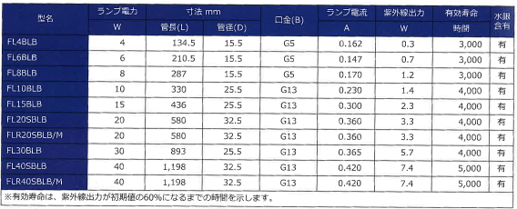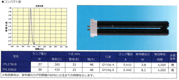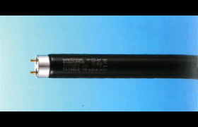 ブラックライト蛍光ランプ(BLB)は、光化学作用と蛍光作用の強い紫外線 315nm∼400nm の波長域(UV-A)を放射するランプです。可視光線を吸収し、この波長域の紫外線を効率よく透過する濃青色のフィルターガラスと、紫外線 360nm 付近に発光スペクトルのピークをもつ蛍光体を使用しております。試験、検査、鑑別、調査などの光源として利用されております。また暗い所で蛍光塗料を鮮やかに発光させ、幻想的な雰囲気をかもすブラックライト独特の演出効果は、ディスプレイ、舞台照明、広告宣伝、イベント会場など多くの分野で活用されております。
