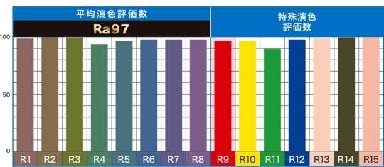 ・赤(R9)や日本人の肌色(R15)を含む特殊演色評価数Riも高水準を実現!