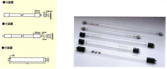 水殺菌用、表面殺菌用など、用途に応じた多品種のランプを取り揃えておりますが、大別すると高出力ランプとオゾンランプの二種類になります。高出力ランプは、食品、医療、化粧品、電子工業など、多くの分野で必要とされる高純度の水の殺菌処理や、容器、器具、包装材などの表面殺菌などに適したランプです。また殺菌紫外線 253.7nm と同時に、オゾン生成作用をもつ 185nm の紫外線を石英ガラスを用いたオゾンランプ(短波長ランプ)は、光洗浄や表面処理、空気殺菌や脱臭などの目的で使用されております。